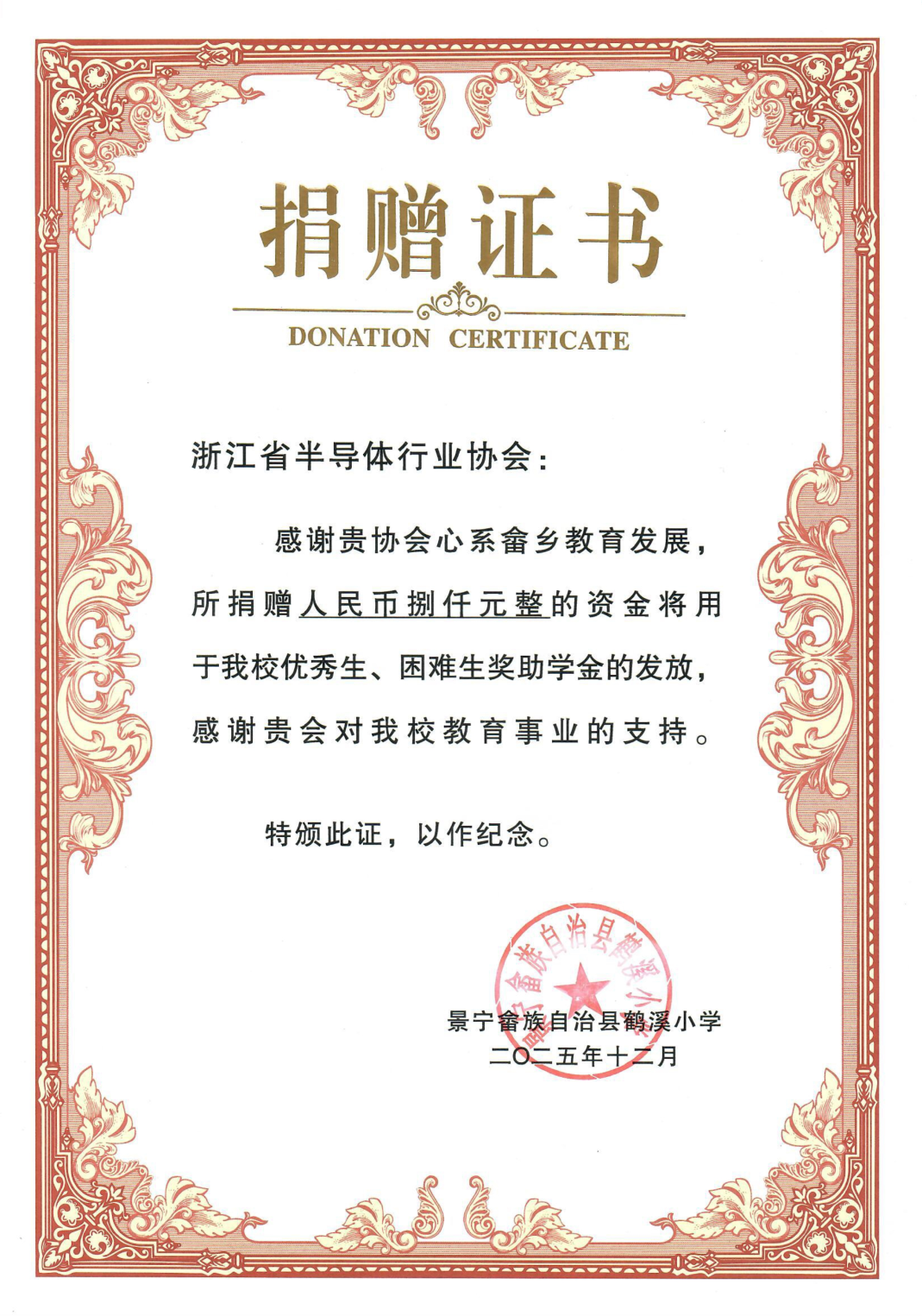 为大力支持我省贫困山区教育事业发展,近期,浙江省半导体行业协会向景宁畲族自治县鹤溪小学捐赠“芯馨”奖助学金8000元,帮助品学兼优、家庭经济困难的学生解决实际问题,营造良好的学习氛围。